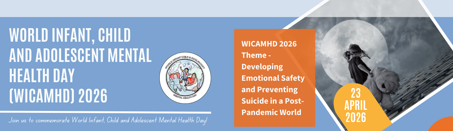 This year's theme is "Developing Emotional Safety and Preventing Suicide in a Post-Pandemic World". Join us as we commemorate World Infant, Child and Adolescent Mental Health Day (WICAMHD).