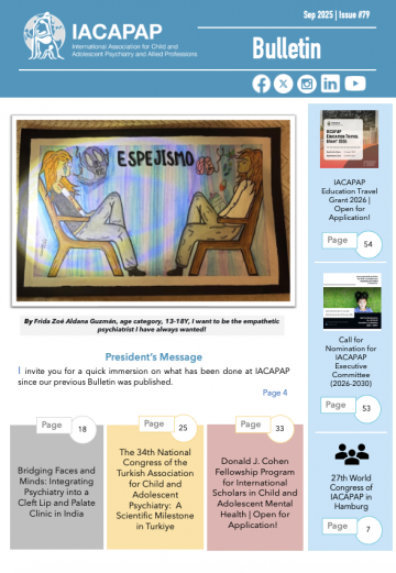 The IACAPAP Bulletin, edited by Dr Hesham Hamoda, MD, MPH, Attending Psychiatrist at Boston Children’s Hospital and Assistant Professor at Harvard Medical School, USA (Hesham.Hamoda@childrens.harvard.edu), and assisted by deputy editors, Dr Lakshmi Sravanti, MD, DM, Assistant Professor at the Department of Child and Adolescent at National Institute of Mental Health and Neurosciences (NIMHANS), an Institute of National Importance (INI) in India (drsravanti@yahoo.com) and Dr Rajesh K. Mehta, MD, FAPA, Child & Adolescent Psychiatrist at Children's Hospital of The King's Daughters in Norfolk, Virginia, USA (rmeht2033@gmail.com), provides official IACAPAP information regularly.